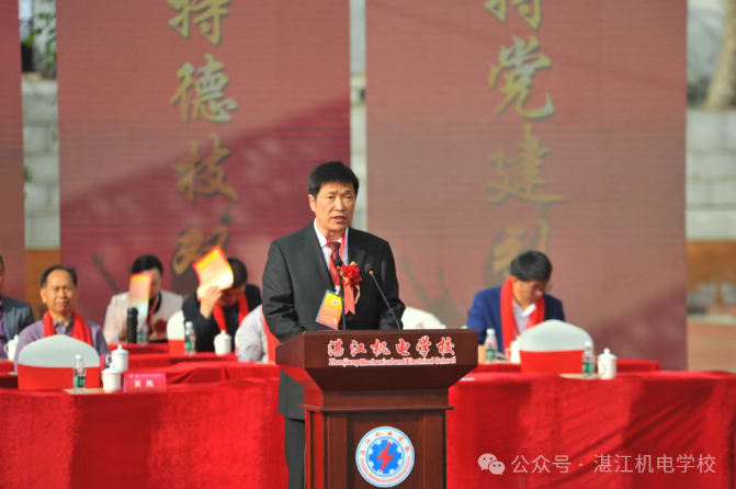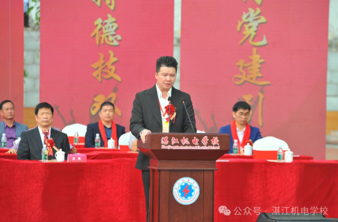 湛江市教育局四级调研员黄凯在随后的致辞中,对学校五十年来取得的丰硕成果给予了高度评价。他提到,学校历经五十年发展,跻身国家级重点中职学校、国家中等职业教育改革发展示范校行列,特别是近年来,为湛江产业发展培育输送了大批优秀技能人才。面向“十五五”规划的新要求,他希望学校坚守育人初心、聚焦内涵发展、深化产教融合,在职业教育改革中勇当先锋;并表示教育局将持续支持学校建设,期待学校再创辉煌。