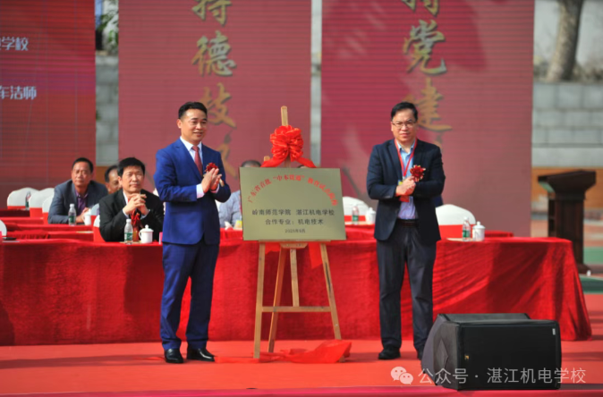 湛江市教育局四级调研员黄凯(右一)和学校党委书记王安贤为广东省高水平中职学校揭牌